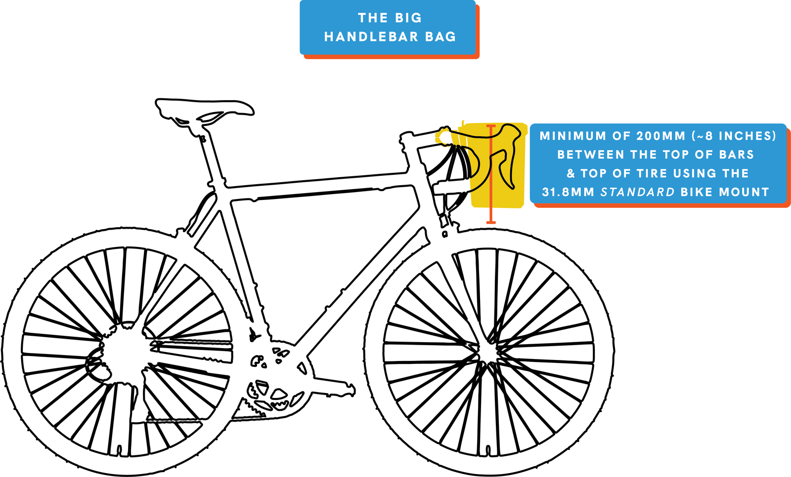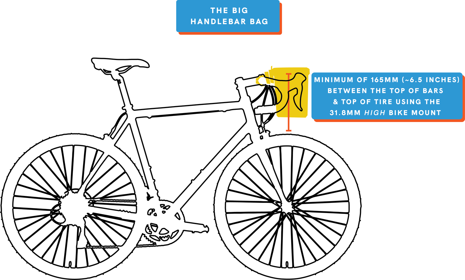 Properly mounted ( level, with Bike Mount bolts set to recommended torque), your Bag should never contact your front wheel. Given the direction of rotation of your front wheel, even if the worst was to happen - your Bag make contact with your front wheel - it is unlikely that a flip over your bars would result but with all the possible variables, we can’t say that chance is zero. Determining how much space your have between your handlebars and the front wheel is the most critical. To find this measurement on your bike, you will need to determine the distance from the center, top of your handlebars and the horizontal line intersecting the top of your front tire, as shown in the image below.