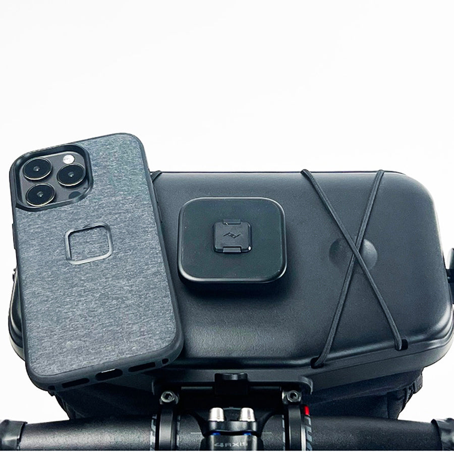 Der Route Werks Peak Design-Adapter wird direkt am Deckel der Lenkertasche oder der Out Front-Halterung angeschraubt, um die Peak Design Mobile Head Unit von der Peak Design Out Front Bike Mount V2 (separat erhältlich) aufzunehmen und ist für die Verwendung mit den Peak Design-Hüllen vorgesehen.